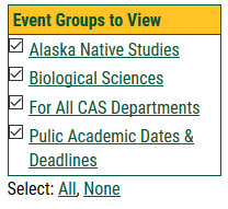 Calendar List This only works if you use Sub-Calendars to populate your calendar. To ensure that you do not get duplicate events on your calendar you must ensure that an event is only ever added to one of the sub-calendars. The best way to do this is to create your overall calendar directly in 25Live publisher and then send all of your sub-calendars as published searches under the main calendar you created in 25Live Publisher. The list you see will be the names of your sub-calendars. |