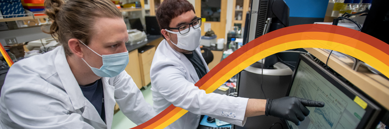 Two students in lab coats and masks examine data on a computer screen