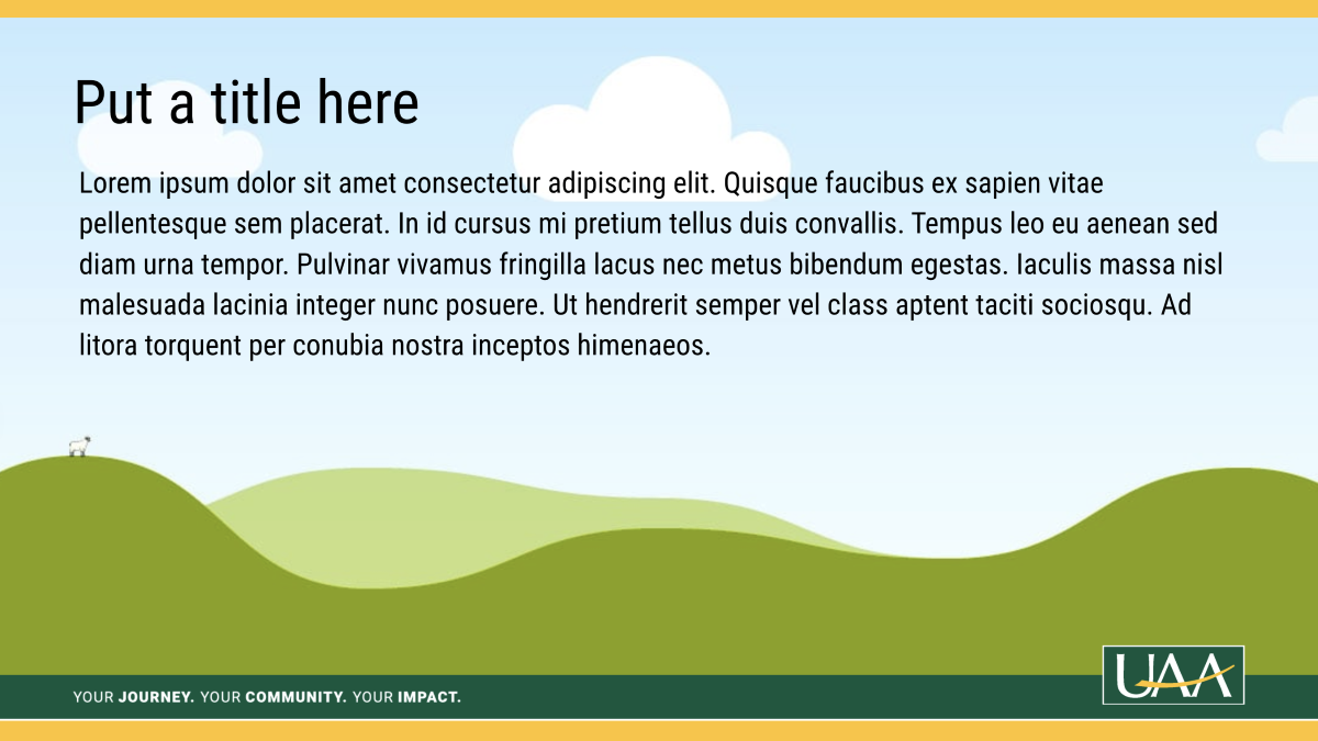 This is a Microsoft PowerPoint template for use by official departments and units within UAA. This is a standard 16:9 format presentation. Instructions on how to replace the current placeholder logo with your unit’s logo are on the first cover page and within the Notes. If you do not have your authorized unit logo you can download it from our UAA Logos page.