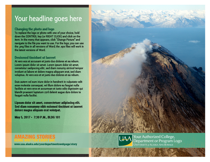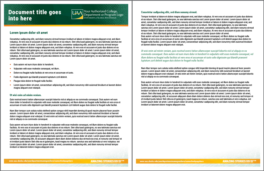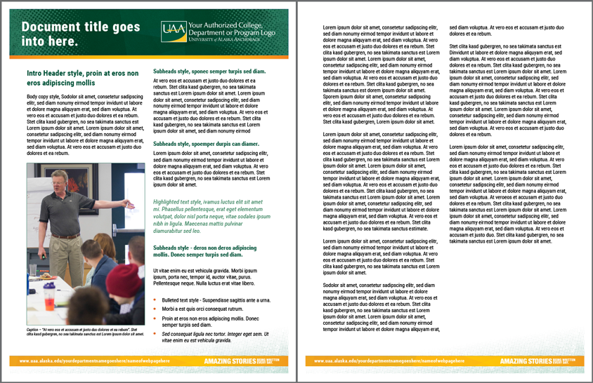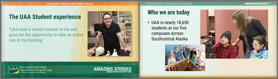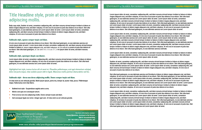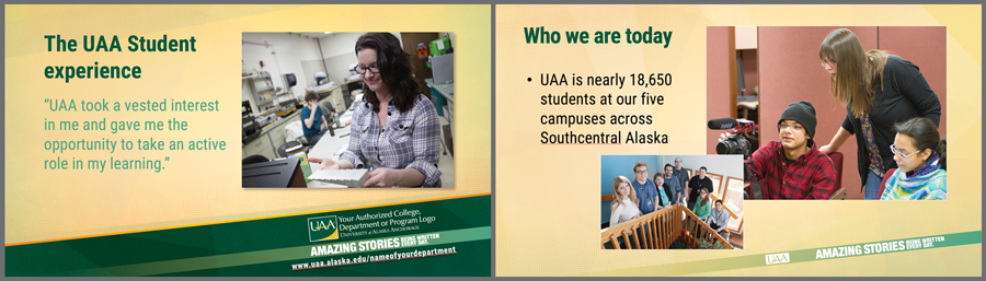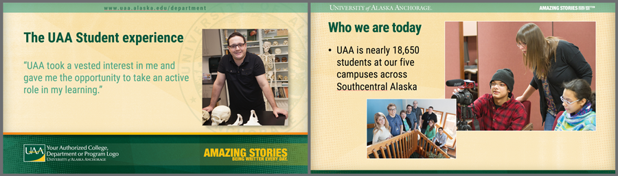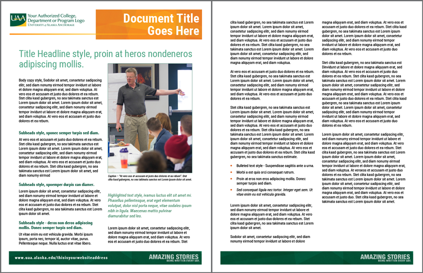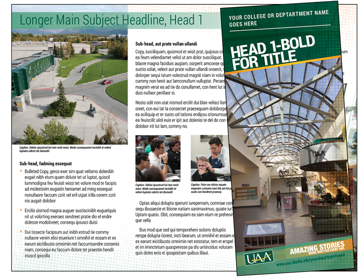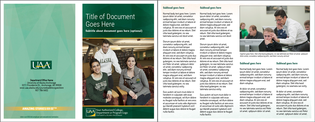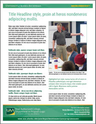 Each year across UAA, thousands of print and electronic publications are produced for external distribution. The print publication templates provided here are a tool for UAA employees wanting to create branded materials for their areas. As a part of UAA’s overall brand effort, these templates will help ensure consistency and accuracy in the use of the university’s visual identity.