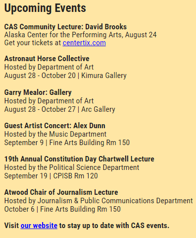 The event also exemplifies our goals to be a valuable resource to our community and to be a good community partner. Our event is supported by our community partners, The Alaska Center for the Performing Arts, who is hosting this event, Alaska Airlines, Alaska Public Media, the Atwood Foundation, and many more. I hope you can join us on August 24, for this unique event. Our 2023 Community Lecture will also give the College an opportunity to share our many areas of excellence with our community. We will have information and exhibits in the foyer, the hallways, and the lobby of the PAC for patrons to view before and after the lecture.