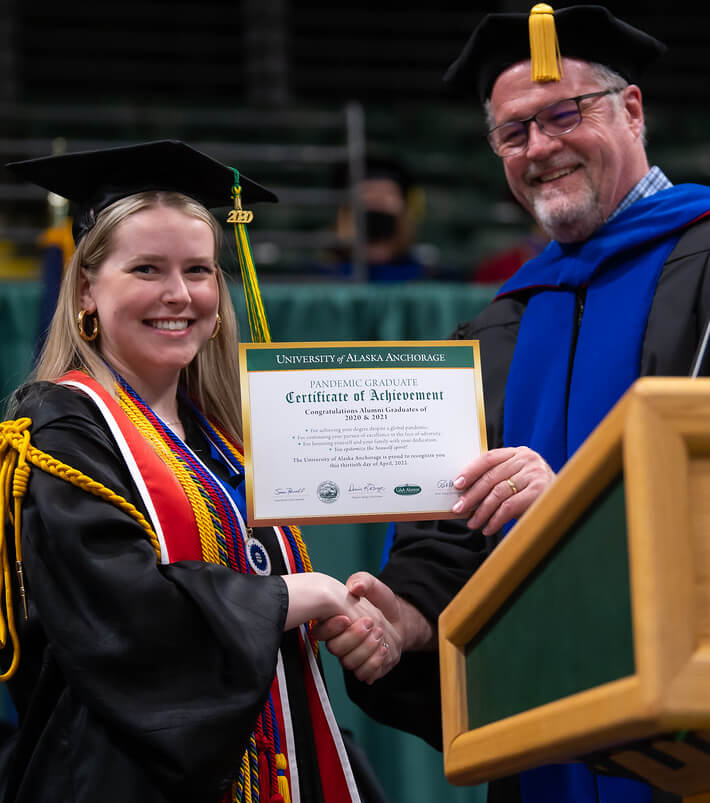 The speeches Clare and Alex delivered in 2020 focused on representing UAA in the community and on perseverance. This year they had some related insights for graduates: “As you reflect on your own path to graduation, remember that our classes represent the best our state has to offer. Graduating from college is always something to be celebrated, but even more so for us as we have persevered through some of the toughest years in the history of our university. We represent the strength of our institution and the transformative impact education can have.”
