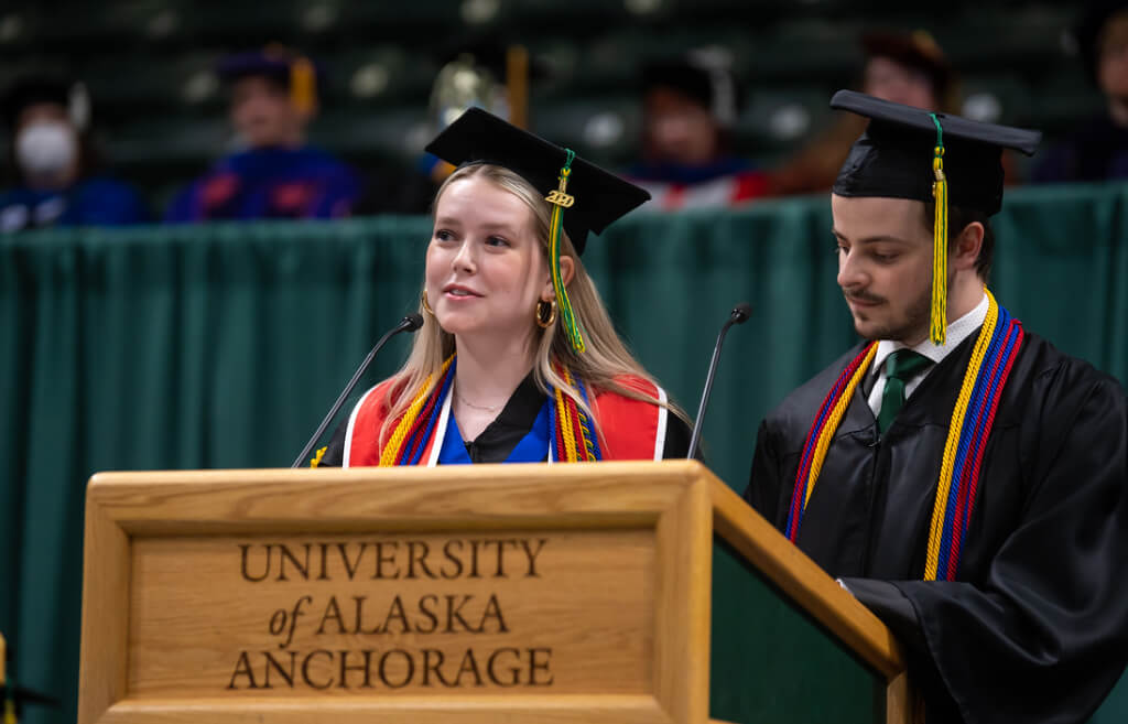 “Graduating college is a huge milestone in our lives, and we get one day to celebrate all the hard work it took to get there,” Clare said. “It felt rewarding and well overdue to deliver our speech to our peers, families, and UAA community. We got to speak directly to our friends and families and share the experience together.”