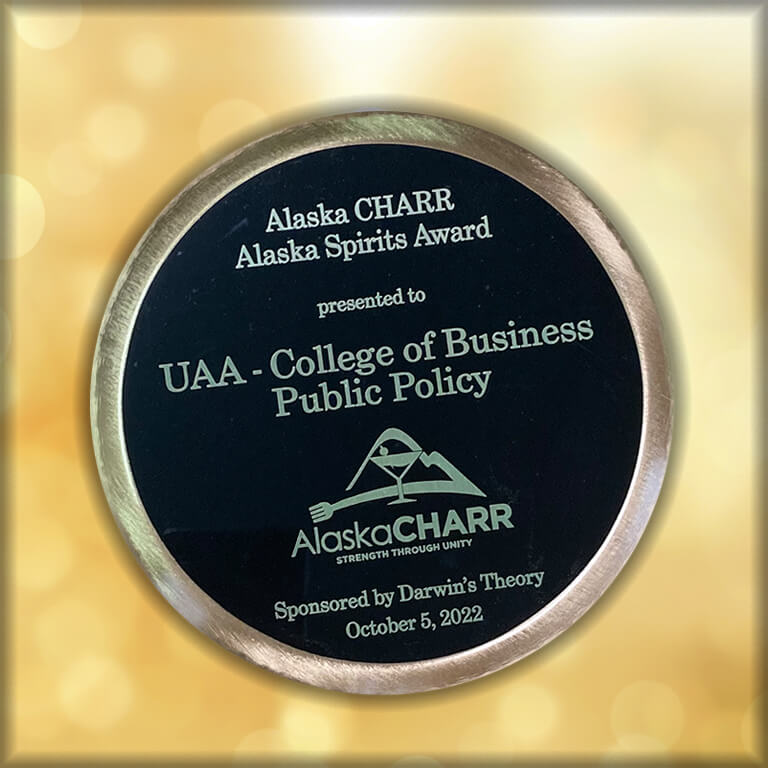 November 29, 2022During Alaska CHARR’s 18th Annual Heroes of Hospitality Awards Program, Dr. Terry Nelson accepted the Alaska Spirits Award on behalf of the College of Business and Public Policy (CBPP). This award is given to the business that shows leadership to improve the industry.