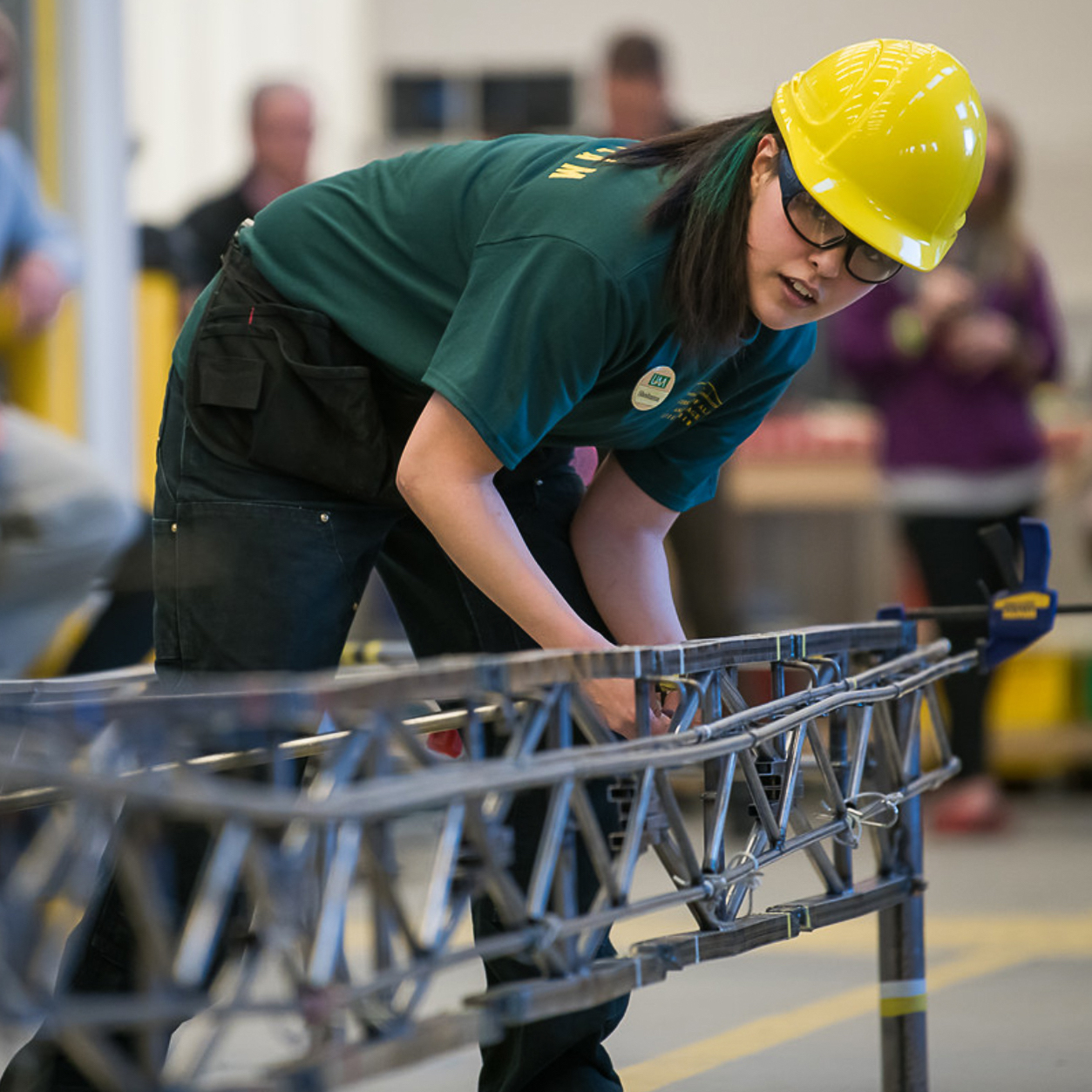 Student wearing a hard hat looking down a miniature bridge