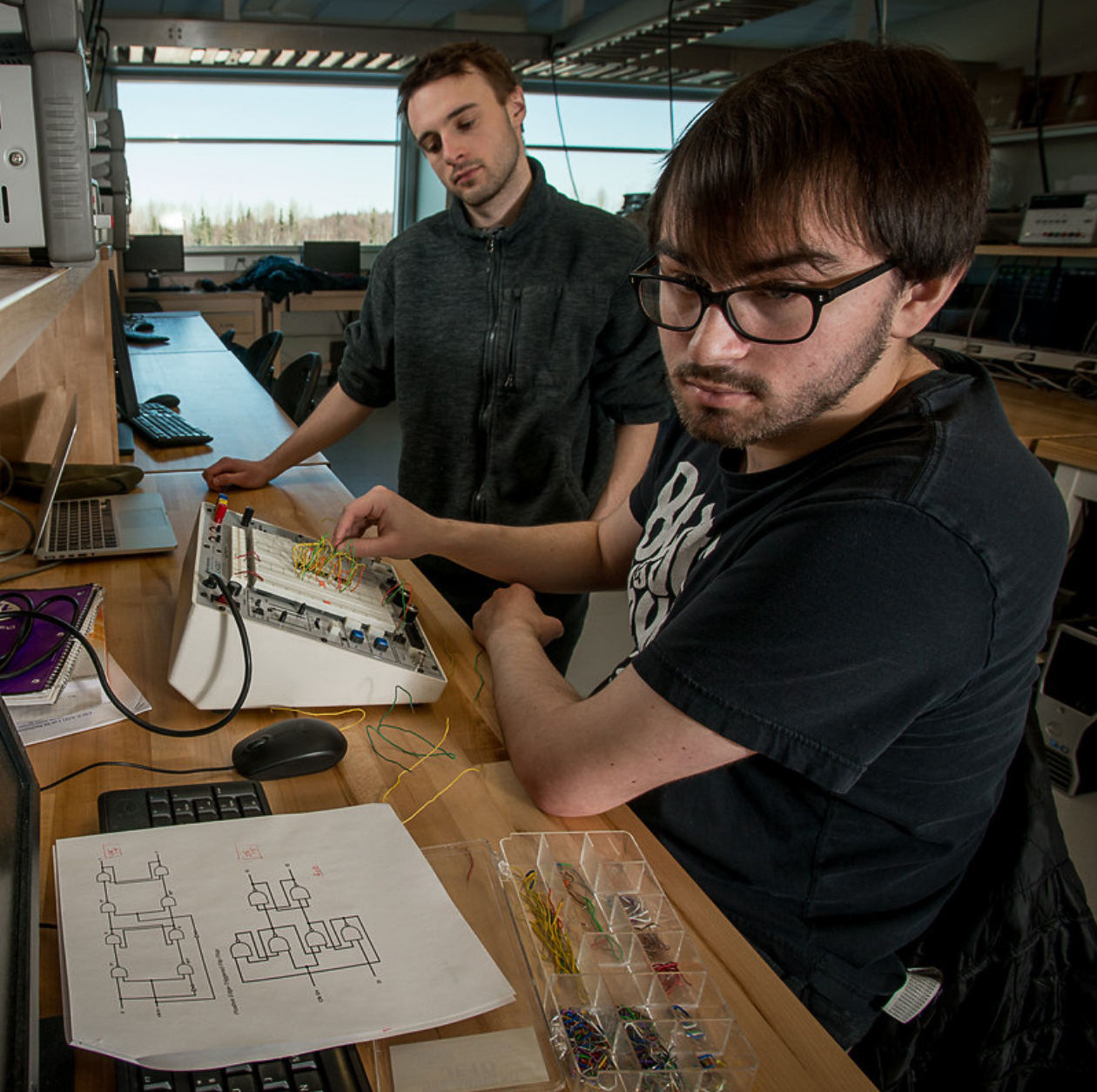 Student adjusting circuits on a circuit board according to a nearby printed schematic diagram