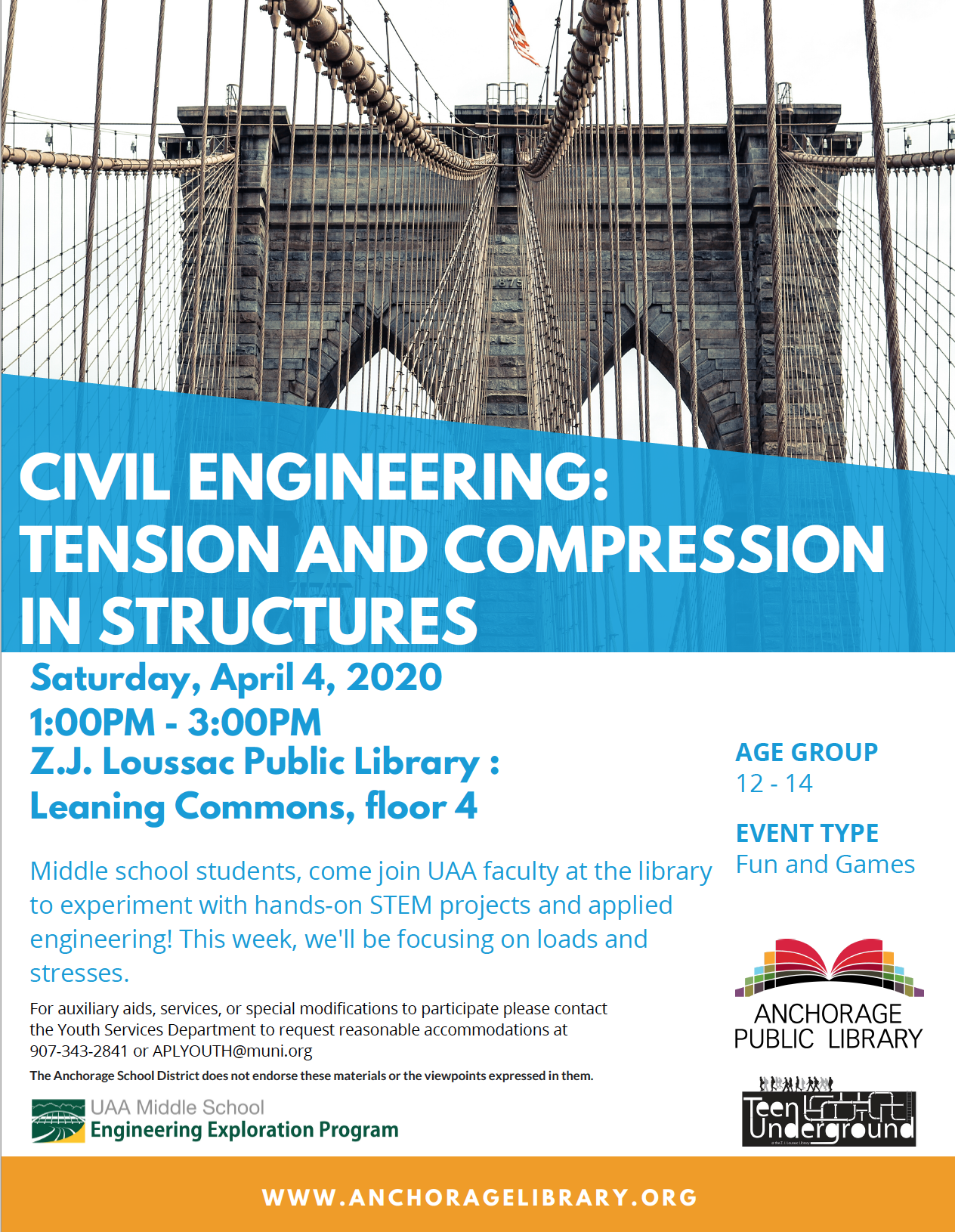 Through our parntership with the Z.J. Loussac Library, we provide workshops for middle school students (grades 6-8), introducing them to core concepts within a variety of disciplines including civil engineering, electrical engineering, mechanical engineering, and computer science.