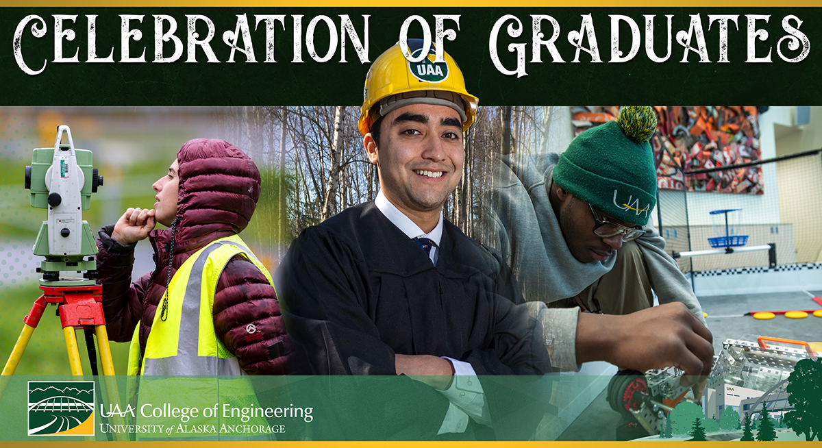 Each fall and spring the UAA College of Engineering faculty and staff celebrate your hard work and achievement of completing your degrees at our Celebration of Graduates event during which graduates of all seven disciplines including Civil Engineering, Computer Science, Computer Systems Engineering, Electrical Engineering, Geomatics, Mechanical Engineering, and Project Management are recognized. Graduates of some of the disciplines also have an opportunity to take the oath of the Order of the Engineer and/or the Pledge of the Computing Professional. During our spring event, we may also recognize our College of Engineering Alumni of Achievement award recipients.
