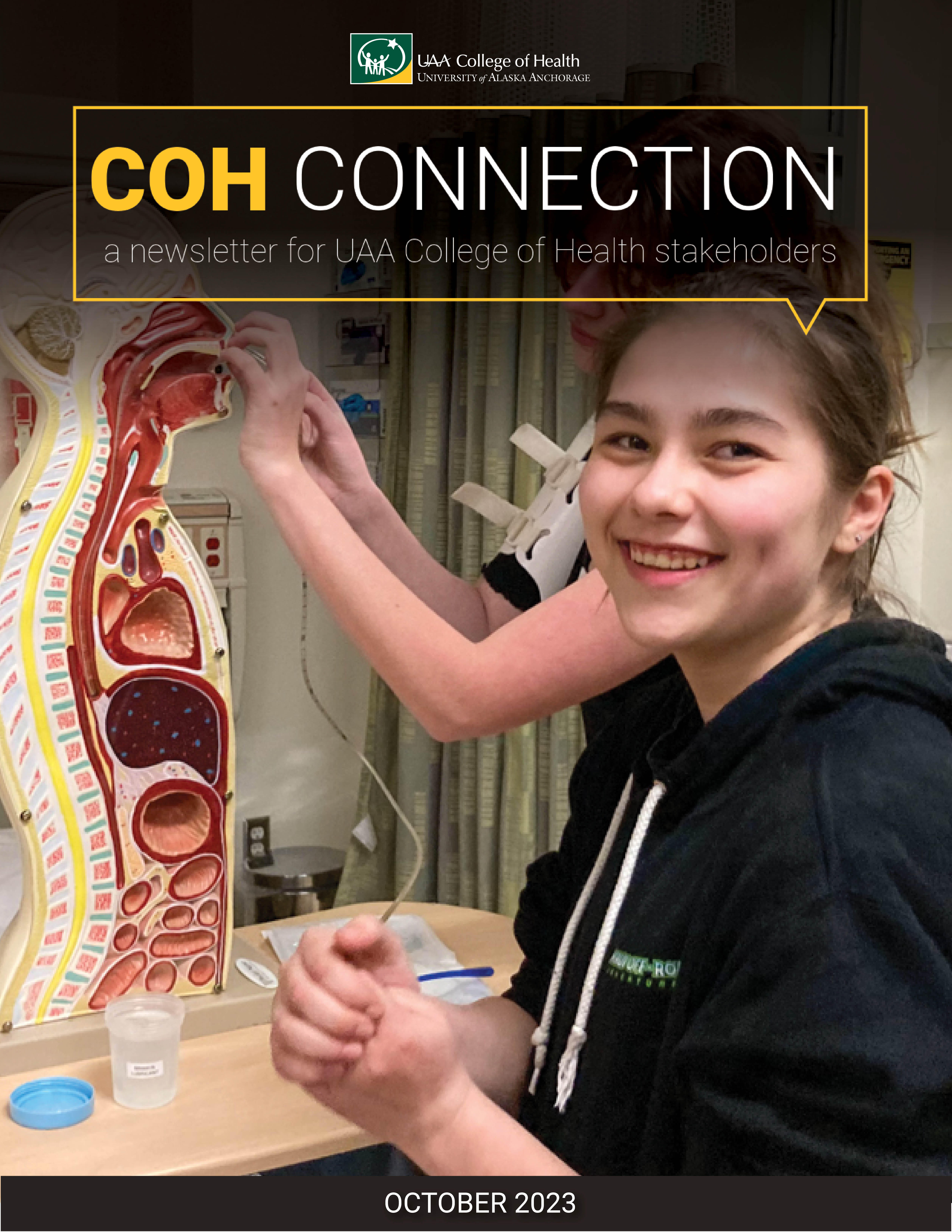The COH Connection is the University of Alaska Anchorage College of Health (COH) newsletter designed for COH friends, donors, and stakeholders in the Alaska health care community. This newsletter aims to illustrate some of the incredbile work that COH students, faculty, and staff remain engaged in. Educating students to enter the Alaska health workforce is our primary focus, from nursing to public health to phlebotomy to justice to social servies – our 45 academic programs, research centers, and community services are working hard to address statewide needs. Enjoy a few snapshots of such projects in each COH Connection newsletter:
