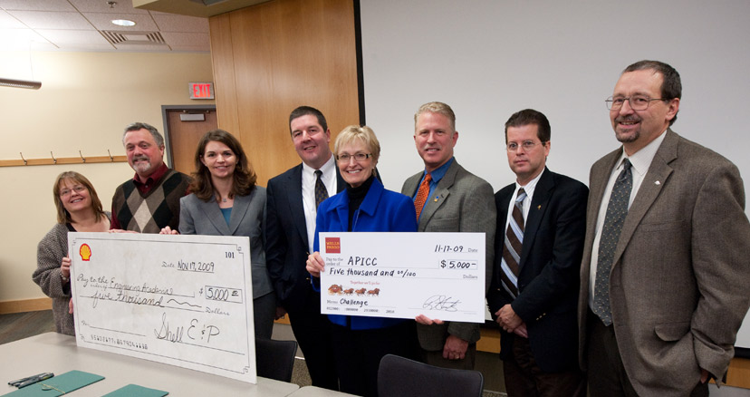 [Click image for larger view. From left to right: Laurie Becwar, Human Resources Manager, Shell Alaska; Todd Bergman, Executive Director, Alaska Process Industry Careers Consortium; Susan Moore, Operations Manager, Shell Alaska; Joe Everhart, Senior Vice President and Alaska Business Banking Manager, Wells Fargo Bank; Fran Ulmer, Chancellor, University of Alaska Anchorage; Les Morse, Deputy Commissioner, Alaska Department of Education and Early Development; David Stone, Deputy Commissioner, Alaska Department of Labor and Workforce Development; Bob Shefchik, Executive Officer, University of Alaska Fairbanks. Not pictured: John Pugh, Chancellor, University of Alaska Southeast]