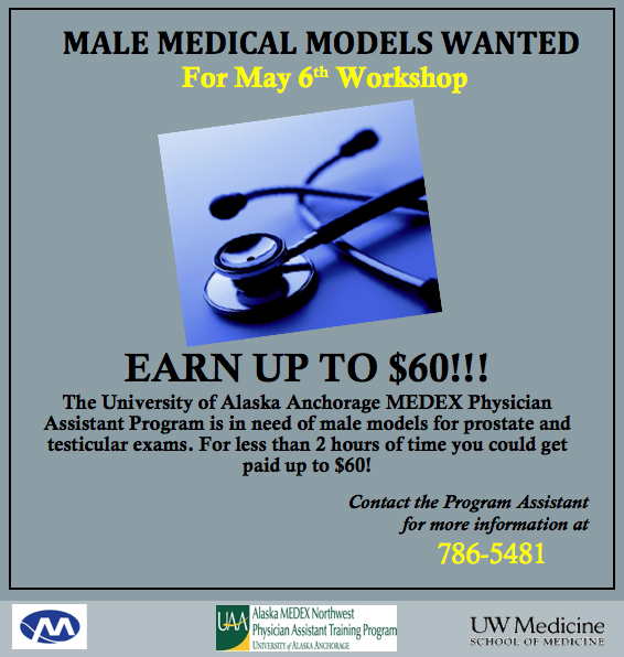 The University of Alaska Anchorage MEDEX Physician Assistant Program is in need of male models for a medical training workshop. Click here for details on what the workshop is about and how to sign up as a model. For less than two hours time you could get paid up to $60. Contact the program assistant for more information at (907) 786-5481.