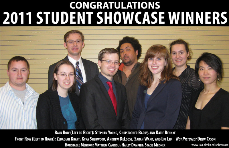 The UAA Student Showcase 2011 winners were announced at an awards luncheon on Saturday, April 9. UAA students, faculty, family, friends, alums, and community members gathered in the Lucy Cuddy Hall to acknowledge the conference presenters in the 2011 Student Showcase. Forty-eight students presented their work in this year's conference and over 30 community professionals and UAA alums served as session commentators and judges.