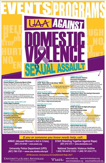 A comprehensive list of these events can be found on the UAA Against Domestic Violence and Sexual Assault calendars posted around the main campus and in Residence Life. View the poster here.