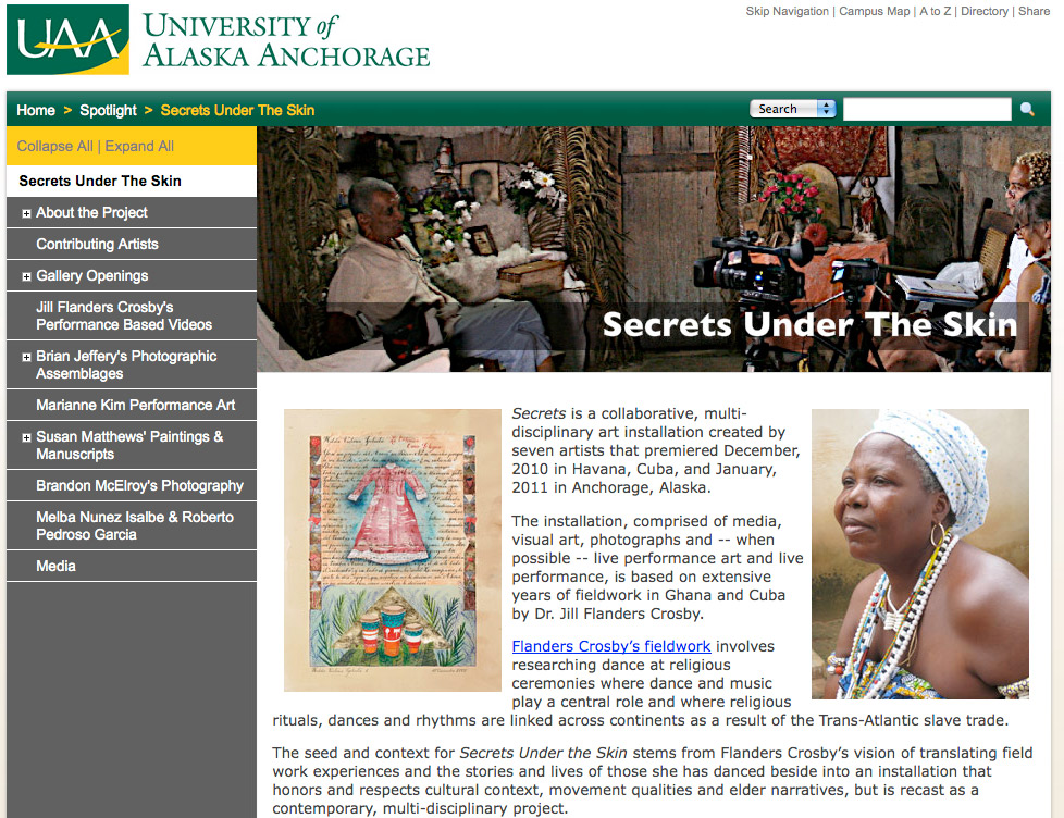 Crosby's work is the result of two decades of research on dance at religious ceremonies in Africa and Cuba, linked across continents as a result of the Trans-Atlantic slave trade. Her work culminated in a collaborative, multi-disciplinary art installation in Havana, Cuba in December 2010 and at the Kimura Gallery at UAA in January, 2011. This rich website documents both of the art installations, but also includes documentary research footage, oral history, images of collaborative 2D and 3D artwork, video of original choreography and statements from collaborating artists.