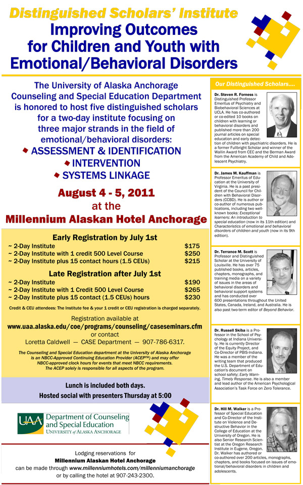 Click here for a workshop poster. Registration is available at www.uaa.alaska.edu/coe/programs/counseling/caseseminars.cfm. For more information, please call (907) 786-6317 or CASE@uaa.alaska.edu.