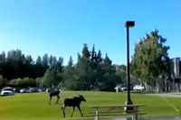 VIDEO: Moose twins frolic in sprinklers at UAA