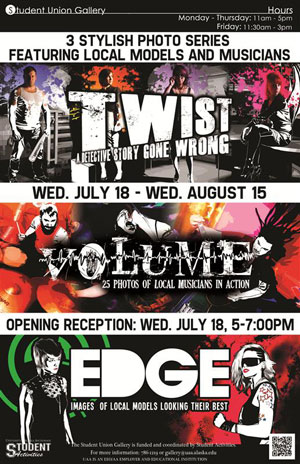 For more information on this exhibition, visit http://www.uaa.alaska.edu/sll/activities/gallery.cfm and click on "Twist/Volume/Edge." You can also contact the Student Union Gallery at (907) 786-1052, (907) 786-1219 or gallery@uaa.alaska.edu.
