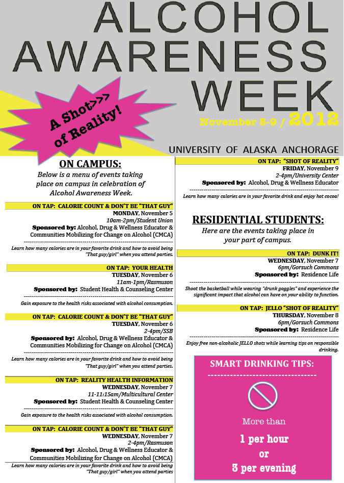 These events are all sponsored by a combination of supporters including Communities Mobilizing for Change on Alcohol, Student Health & Counseling Center and Residence Life. For more information, please contact Amanda Murdoch, Alcoho, Drug & Wellness Educator at (907) 786-1511 or armurdock@uaa.alaska.edu.
