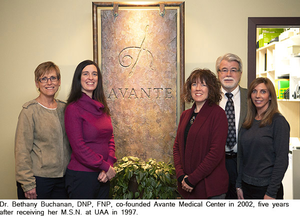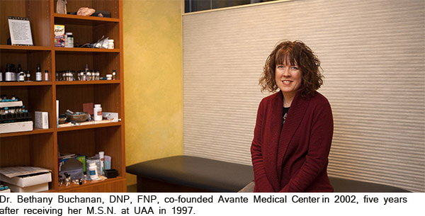 Dr. Bethany Buchanan, DNP, FNP, (M.S.N. '97) had been working as a family nurse practitioner for five years in Alaska when Dr. Jason Harmon, ND, approached her about co-founding a new kind of medical clinic in Anchorage. Integrative medicine: combining the best of science and nature, which translates into a blend of traditional and natural modalities. Dr. Harmon saw in Bethany the reputation she had earned working at Alaska Alternative Medicine Center since earning her master's degree in nursing in 1997 from UAA. Between Bethany's energy and Dr. Harmon's business sense, in 2002 Avante Medical Center was born.