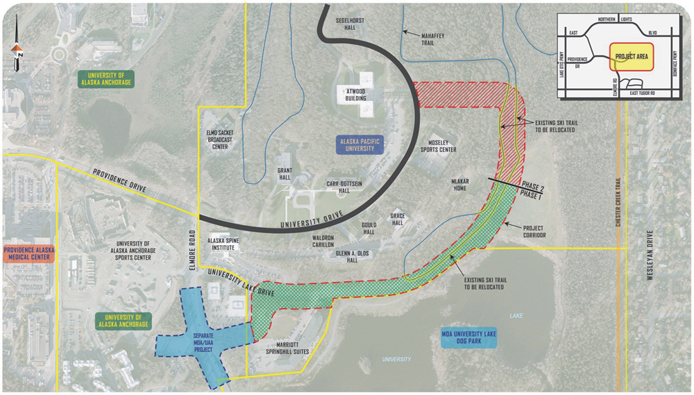 The Municipality of Anchorage (MOA) Department of Public Works, Project Management and Engineering Division (PM&E) is working with Alaska Pacific University (APU) to upgrade and extend University Lake Drive eastward and northward to eventually connect with University Drive. The proposed road extension will be on APU's campus north of the MOA's University Lake Dog Park.