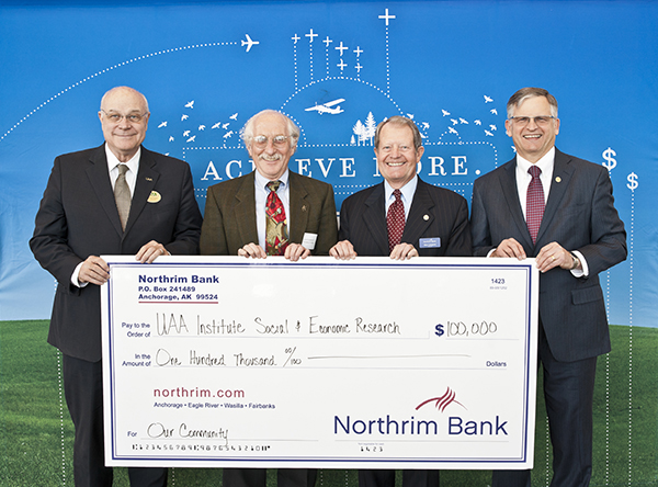 Northrim Bank Chairman Marc Langland presented a check for $100,000 to Chancellor Tom Case at the Northrim Bank Annual Economic Update Luncheon last week. The generous gift supports the Institute for Social and Economic Research (ISER) initiative "Investing for Alaska's Future" directed by Scott Goldsmith, ISER professor emeritus.