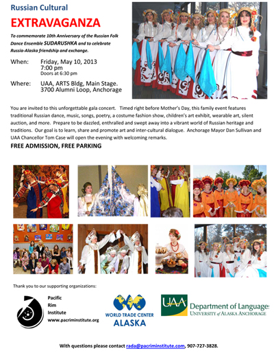 It's been 25 years since the opening of the border between Russia and Alaska. To celebrate this and other important milestones as well as Russia-Alaska friendship, the Russian community is coming together for a gala event. This family event features traditional Russian dance, music, songs, poetry, a costume fashion show, children's art exhibit, wearable art, silent auction and more. Prepare to be dazzled, enthralled and swept away into a vibrant world of Russian heritage and traditions. Our goal is to learn, share and promote art and intercultural dialogue. Anchorage Mayor Dan Sullivan and UAA Chancellor Tom Case will deliver welcoming remarks.