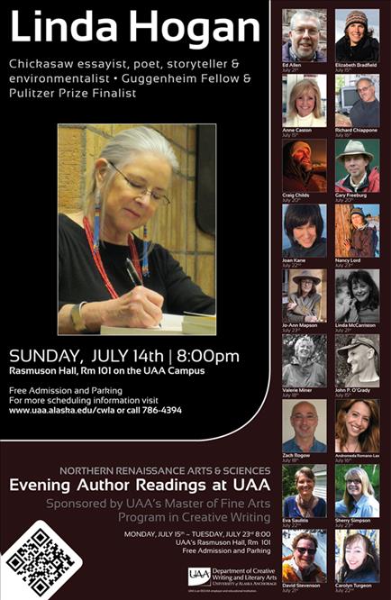 The Northern Renaissance Arts and Sciences Series, sponsored by UAA's M.F.A. in Creative Writing program, offers more than a week's worth of amazing lectures and writing every July. Chickasaw essayist, poet, storyteller and environmentalist Linda Hogan opens this year's series on July 14 with the keynote, followed by nightly readings by CWLA faculty, students and distinguished guest lecturers. Parking and admission are free. All readings begin at 8 p.m. in Rasmuson Hall, Room 101. Full schedule: