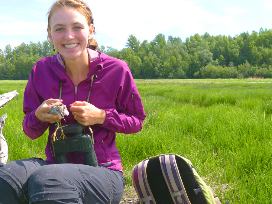 Tess Forstner, a junior at UAA, spent her Alaska summer dressed in Xtratufs, wading through wetlands on a quest for chicks. Boreal birds, actually. She also wrangled a couple dozen volunteers who were willing to tromp through their backyard wetlands in Anchorage and the Matanuska Valley to monitor target species-Lesser Yellowlegs, Greater Yellowlegs, Solitary Sandpipers, Rusty Blackbirds, Olive-sided Flycatchers, Tree Swallows and Violet-green Swallows. Each sighting of the highlighted species meant a 30-minute phone call for Tess from an excited birder. And she loved every minute of it.