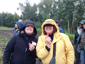 Legislators Geran Tarr and Harriet Drummond enjoying strawberries in the field on Arthur Keyes' farm in Palmer in August 2013.