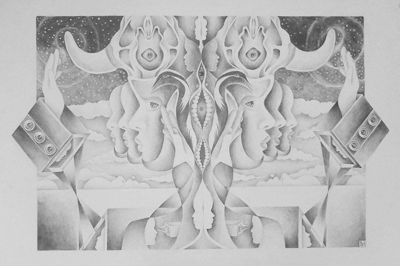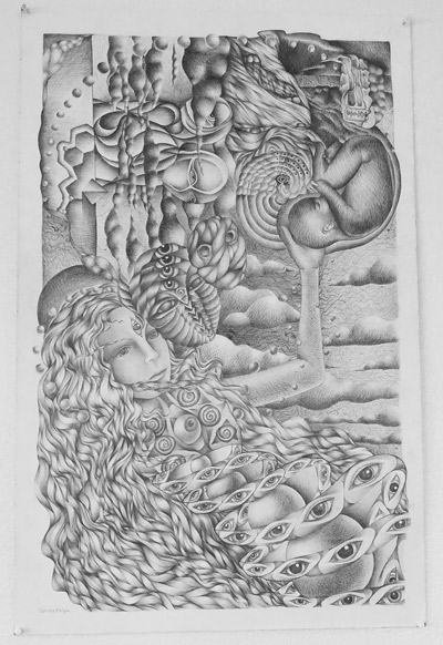 (Click to see larger view). Spiraling Life "was for an intermediate drawing class done in ballpoint. It's about overcoming obstacles and expanding awareness. You have two sides to yourself. The side you show people and the side you hide away."