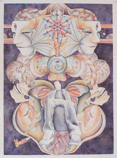 (Click to see larger version.) "Tripping" was a final project in a watercolor class. "People misinterpret what psychedelics are. We don't take them seriously; lots of cultures do. For some indigenous cultures it is a very structured experience."