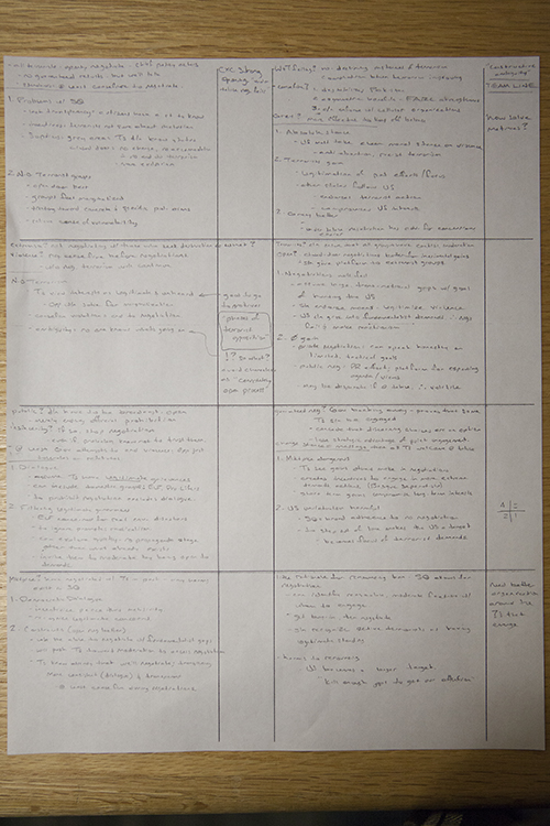 Steve Johnson, coach of the Seawolf Debate team, created this "flow" to outline arguments made during a round of debate. Philip Hall/University of Alaska Anchorage