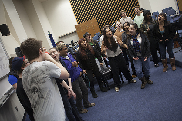 Members of the UAA Glee Club perform a song before practice, in a rehearsal room at the Fine Arts Building. Philip Hall/University of Alaska Anchorage.