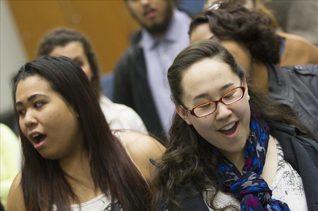 Members of UAA's Glee Club are, left to right, front: Elise Adams, Monica Repuya, Jasmine Araki, Lailani Cook and Samantha Alex; middle: Jillian Pollock, Hunter Woofter, Hazel De Los Santos; back: Edward Washington II, Jenny Gilhuly, Benjamin Chang, Kyle Lindsey, Wright Franklin, Kimber Gee, Mary Rhodes-Rasheed, Brennen Lamb, Rebecca Gamache, Andrew Christian II, Bijan Welch, Adi Davis and Benjo Holganza. Philip Hall/University of Alaska Anchorage.