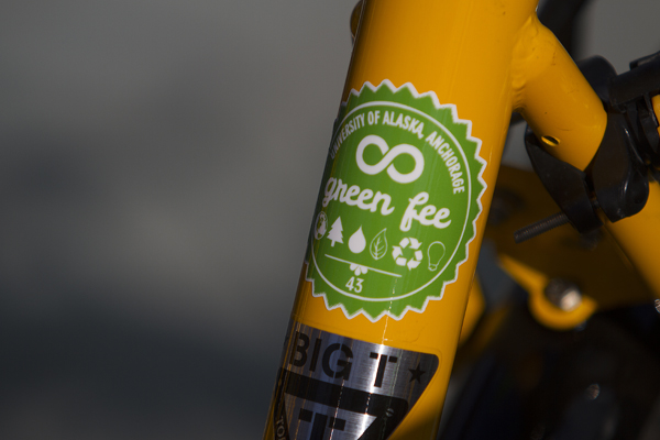 Bikes display the green fee sticker to signal support through student funding. In 2011, students (taking three or more hours of credits) voted to pay $3 a semester toward sustainability initiatives reviewed and selected by the Green Fee Board. Philip Hall/University of Alaska Anchorage.