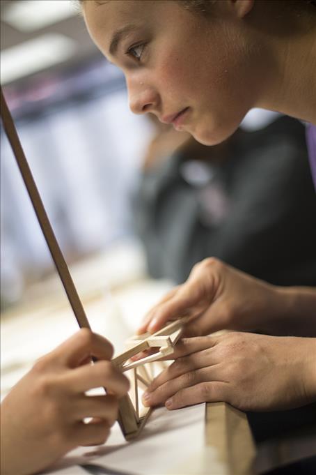 Hannah Romberg, 14, works on a balsa bridge at a UAA summer engineering academy. Photo by Theodore Kincaid/University of Alaska Anchorage.
