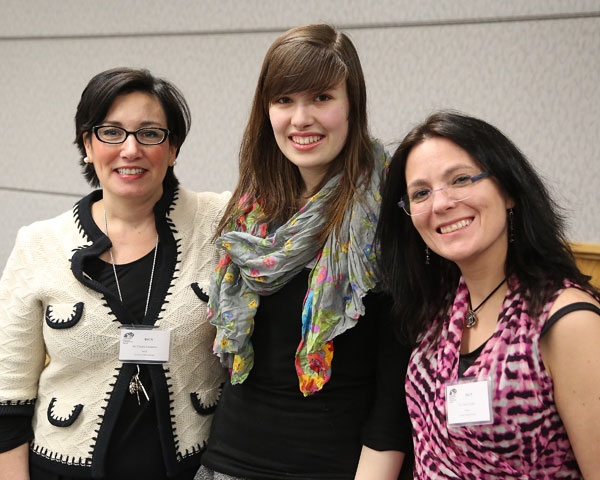 UAA social scientists Claudia Lampman, left, and Gwen Lupfer, far right, and their undergraduate research student, senior Kivalina Grove, center, presented their findings on pregnancy brain bias at a behavioral science conference on campus. The scientists are preparing a paper for publication, and designing another experiment that will gauge the effect on pregnant women when they hear pregnancy will affect their memory adversely, and when they hear it will not. (Photo by Katie Behnke/UAA)