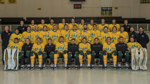 Kendall Hockey Classic championship team, 2013. Note the great fans huddled behind the glass. (Photo by Sam Wasson/UAA Athletics)