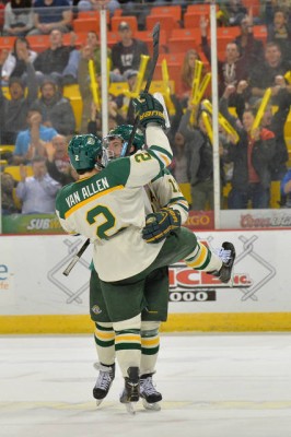 Chase Van Allen celebrates a goal against Air Force in last year's Kendall Hockey Classic. (Photo by Sam Wasson/UAA Athletics)