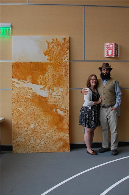Jenna Brooks and Bryan Box stand by Box's "Into the Abyss" artwork, which he displayed in the Sept. 11 "Service Before Self" art auction. The piece is still available for display, he says. (Photo courtesy of Bryan Box)