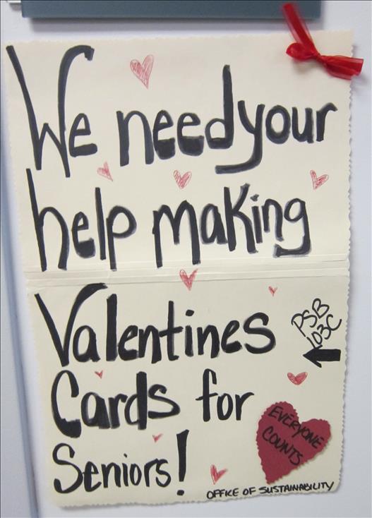 The UAA Office of Sustainability wants to make a difference this Valentine's Day by inviting everyone to help us create cards out of recycled materials to give to the 80 residents at Providence Alaska Horizon House. Please join us in our office on the days and times listed below to make the cards. You may also design cards at home and drop them off at our office. We will have paper materials, ribbon and more, but we encourage everyone to contribute by bringing in items from home.
