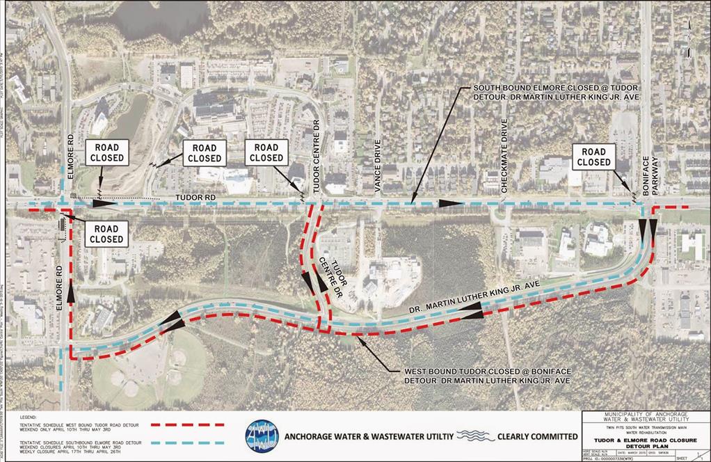 Starting April 10, 2015, Anchorage Water & Wastewater Utility (AWWU) will begin a month-long project to rehabilitate several hundred feet of water transmission main under the intersection of Tudor and Elmore roads. Temporary traffic restrictions will be in place April 10-May 3 on weekends and some weekdays during construction.