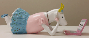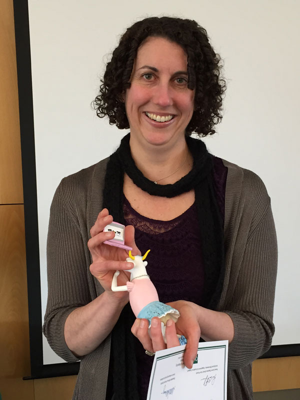 Jennifer Stone, professor of English, was graced with the Computer Cow, another Oscar of academia, for her work mentoring fellow faculty on gamification techniques in the classroom. (Photo by Phil Hall/University of Alaska Anchorage)