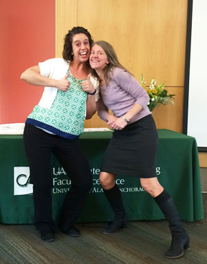 CCEL's Judith Owens-Manley and Kara Joseph accept the "Super cow" award for working to secure "Engaged University" designation for UAA through from the Carnegie Foundation.