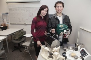 Kolaiah Baker and Anna Hamre earned an Alaska Heart Institute grant for their work on this instrumented mouth guard, designed to glean information about impacts that could cause concussions in athletes. (Photo by Philip Hall/University of Alaska Anchorage)