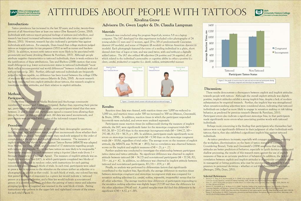 Kivalina Grove participated in the Undergraduate Research & Discovery Symposium, presenting her research into attitudes about people with tattoos.