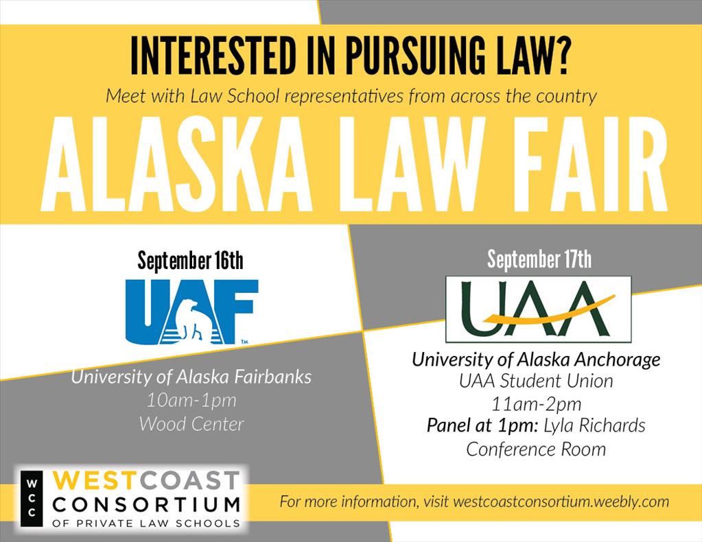 Interested in pursuing a career in law? Meet with law school representatives from across the country at the Alaska Law Fair. Information tables will be staffed 11 a.m.-2 p.m. A panel discussion about law school admissions will begin at 1 p.m. in Lyla Richards Conference Room (Student Union, Room 103). Learn more at westcoastconsortium.weebly.com.