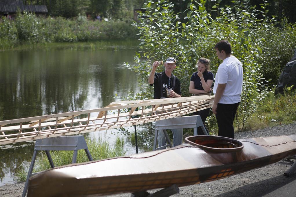 Visiting Danish boatbuilders, at left, work with a summer art intern around the lake at the Alaska Native Heritage Center (Photo by Philip Hall / University of Alaska Anchorage).