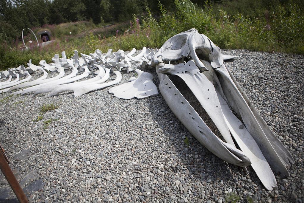 A Grey Whale skeleton is another of the many large outdoor artifacts in the Heritage Center's collection (Photo by Philip Hall / University of Alaska Anchorage).