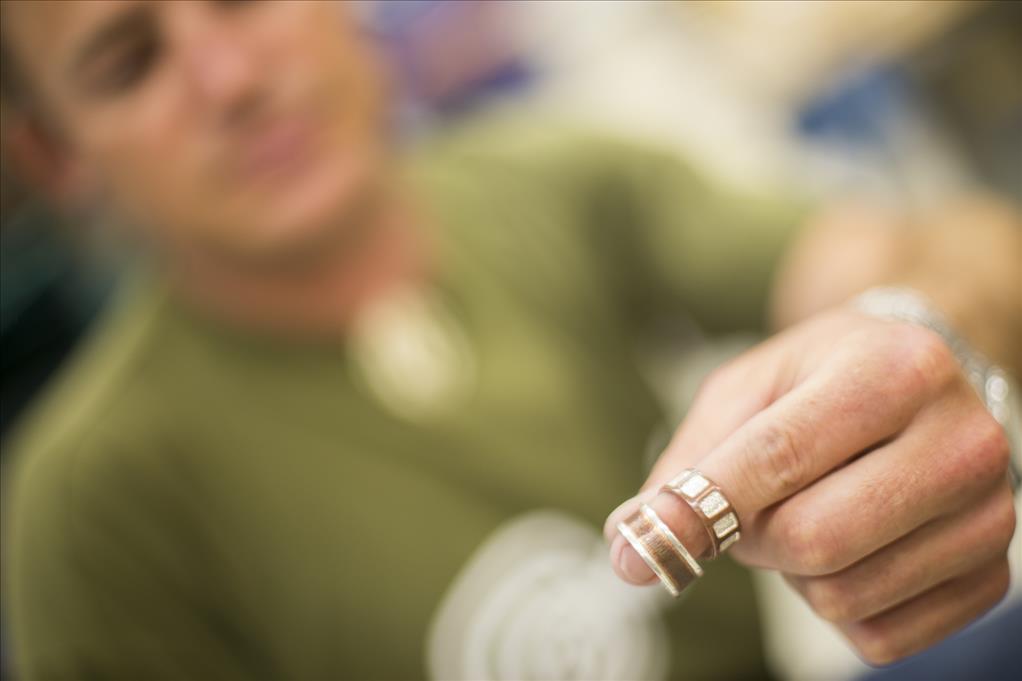Student veteran Tim Craft displays copper and silver rings, textured by pressed fabric in UAA's metalsmithing class (Photo by Ted Kincaid/University of Alaska Anchorage).